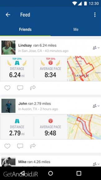 - میتوانید پیشرفت خودرا به اشتراک گذاشته و ببینید دوستان روی فید فعالیت شما چه کاری انجام میدهند. اگر شما یک مبتدی فعال، یا یک علاقه مند به ورزش هستید و یا خودتان را وقف تناسب اندام کرده اید، با اجتماع ٣٠ میلیون نفری کاملا به تناسب خواهید رسید.