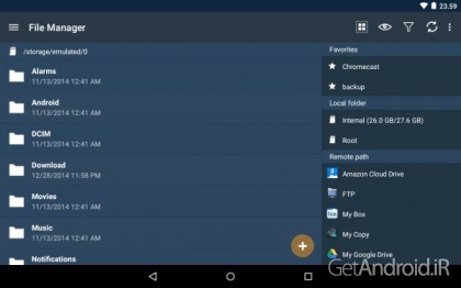FolderSync همچنین دارای یک مدیر فایل کامل است، که شما را قادر به مدیریت فایل های محلی و در ابر می سازد. کپی، انتقال و حذف فایل های شما در حساب های ابر(cloud)/از راه دور(remote) از دیگر ویژگی برنامه همگام سازی و ذخیره سازی ابری است. پشتیبانی از ایجاد/حذف از buckets در Amazon S3 و آپلود و دانلود فایل ها از گوشی نیز از قابلیت دیگر این نرم افزار است.