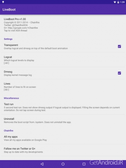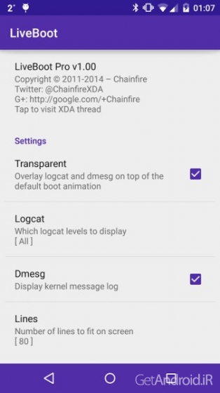 یک انیمیشن بوت است که خروجی های logcat و dmesg آنچه رخ می دهد را بر روی صفحه نمایش به شما نشان می دهد. پیکربندی خروجی شامل سطح logcat، بافر و فرمت انتخابی است.کاربران گرامی توجه داشته باشید :