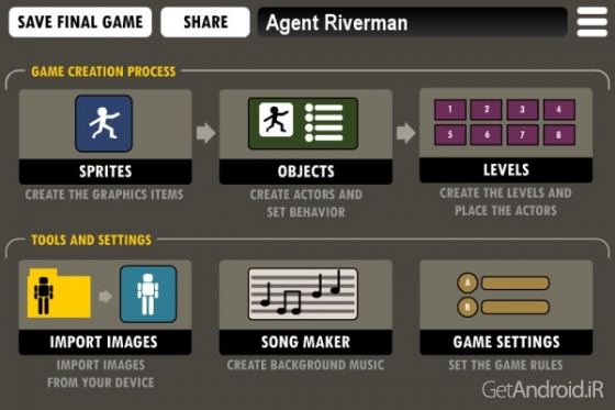 شما می توانید بازی های خود را در گوشی و تبلت خود ایجاد کنید. اگر شما علاقمند به ساخت بازی های اندرویدی هستید و در عین حال در برنامه نویسی تخصص ندارید و نمی توانید ساعت ها وقت و هزینه خود را برای یک برنامه نویس حرفه ای شدن صرف کنید، نرم افزار Game Maker برای شما بسیار مفید خواهد بود تا بتوانید بازی های اندرویدی هیجان انگیزی را بدون این که حتی به یک خط برنامه نویسی یا اسکریپت نویسی نیاز داشته باشید، را برای تبلت و یا تلفن همراه اندرویدی خود بسازید. لطفا توجه داشته باشید که این یک ابزار حرفه ای ایجاد بازی نیست. شما نمی توانید بازی های تجاری ایجاد کنید، و برنامه نمی تواند فایل APK را خروجی دهد. این یک ابزار ساده اما قدرتمند با بسیاری از ویژگی های عالی و توابع آسان برای استفاده و رابط کاربری دوستانه است. شما می توانید از ایجاد بازی های خود، طراحی شخصیت ها، آهنگ سازی، ساخت مراحل خود، تعامل با هیولاها و دشمنان و غیره لذت ببرید. اما اگر شما در صدد ایجاد یک بازی AAA با کیفیت تجاری هستید، این نمی تواند آن چیزی که به دنبالش هستید باشد. دوباره یادآوری می کنیم که امکان خروجی گرفتن بازی ها به عنوان یک فایل APK وجود ندارد.ژانرها: