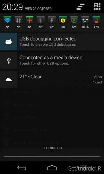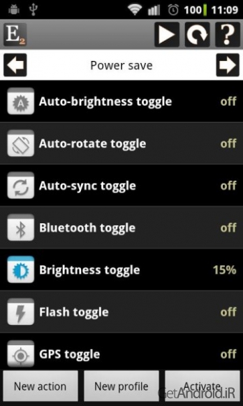 ✤ تغییر تنظیمات: (روشنایی، خاموش شدن صفحه نمایش، …)، انجام کارها (mount/unmount کردن کارت SD، پاک کردن کش، شروع اکتشاف بلوتوث و …)، روشن/خاموش کردن (APN، WiFi، بلوتوث، روشنایی خودکار، چرخش و …)