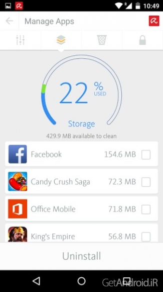 دریافت یک دید کلی از تمام برنامه های روی تلفن همراه خود، مشاهده مقدار فضای اشغال شده آنها و حذف آسان چندین برنامه در یک حرکت.