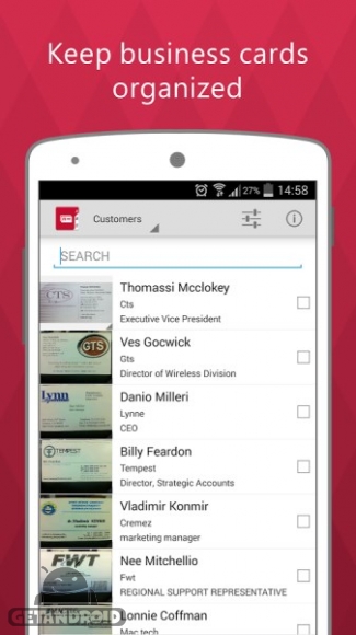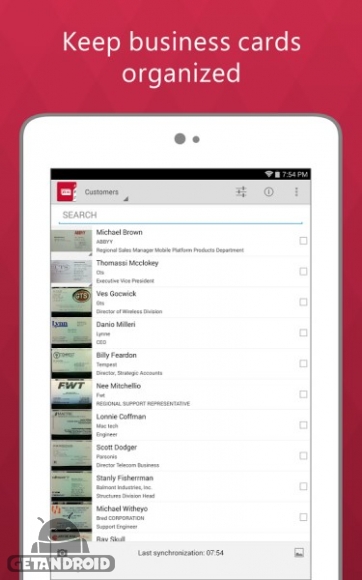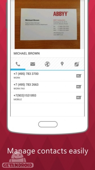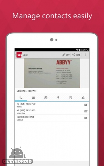 مخاطبین تجاری موبایل شما می باشد. با استفاده از این برنامه قادر خواهید بود از تمامی کارت های تجاری خود اسکن بگیرید و اطلاعات آن ها را ذخیره نمایید . تنها کاری که باید انجام دهید گرفتن یک عکس از کارت موردنظر است ، سپس برنامه به صورت خودکار مشخصات را تشخیص داده و هرکدام را در محل مورد نظر ذخیره می کند و ملاقات مربوط به کسب و کار شما با افراد را یادآوری می کند. این برای کسانی که کارت های تجاری زیادی دارند یا کسانی که عاشق شبکه های اجتماعی تجاری هستند بسیار مناسب است. برای شروع یک کسب و کار موفق، هم اکنون سازماندهی کسب و کار را کسب کنید. این یک برنامه یک برنامه قدرتمند چند منظوره برای مدیریت داده های مخاطبین است که وارد کردن و مدیریت مخاطبین تجاری شما را آسان بوده و از 21 زبان زنده دنیا پشتیبانی میکند.برخی از امکانات برنامه ABBYY Business Card Reader (BCR) اندروید :