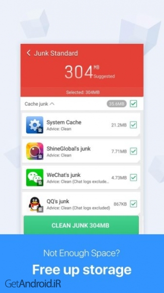 - پاك كننده ی فایل های جانك: پاك كردن فایل های كچ، فایل های جانك باقیمانده، جانك تبلیغاتی و apk از كار افتاده برای اصلاح حافظه. بهبود عملكرد دستگاه