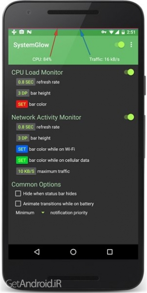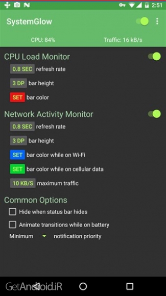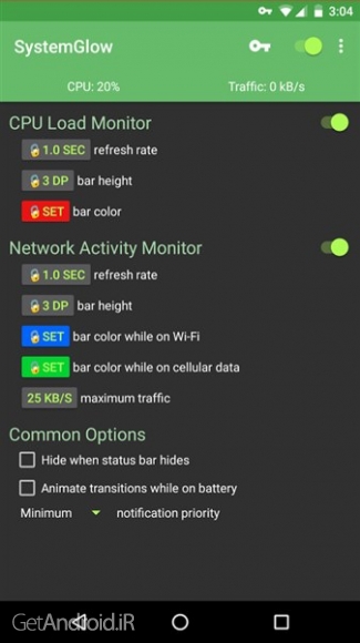 به وسیله برنامه SystemGlow v2.2.0 [Unlocked] ميتوانيد عملكرد CPU و فعاليتهاي شبكه را با يك پوشش عالي و مينيماليستي و در هر زمان ممكن در دسترس داشته باشيد. دو ميله ي قابل تنظيم در بالاي نوار وضعيت به صورت روشن و خاموش قرار دارند و CPU و فعاليت شبكه را تغيير ميدهند.