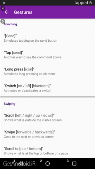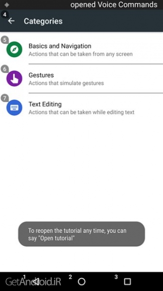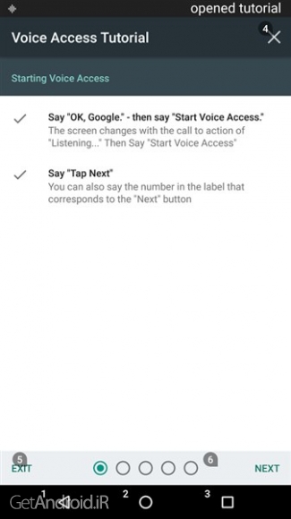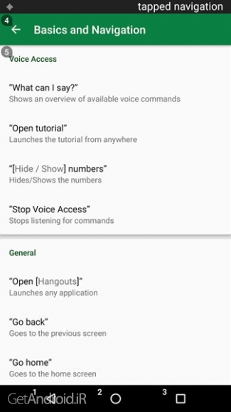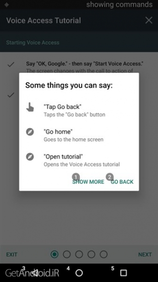 بخش آموزشي، رايج ترين فرمان هاي صوتي را معرفي ميكند، مانند شروع Voice Access, كليك كردن، اسكرول كردن(كشيدن) ،( گت اندروید ) ، ويرايش متن اوليه ، و رفتن به ليست (چه ميتوانم بگويم)