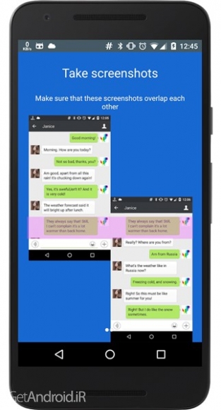 توسط برنامه Stitchcraft: Long screenshot v1.3.0.84 میتوانید چندین اسکرین شات از یک صفحه گرفته و آنها را خودکار به هم وصل کرده و یک اسکرین شات طولانی با اسکرول داشته باشید. به طور معمول اسکرین شات بگیرید. مطمئن شوید که فضای مشترک بین تصاویر وجود داشته باشد. اسکرین شات ها را برای متصل شدن به یک تصویر بلند انتخاب کنید.