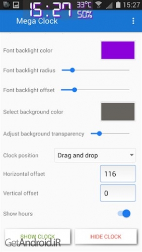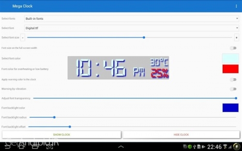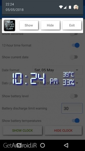 یک ساعت دیجیتال چند منظوره، لانچر، پیش بینی آب و هوا و پاک کردن حافظه بر روی تمام برنامه ها و نظارت بر شاخص های اصلی روی دستگاهتان می باشد. همچنین ایده آل برای هنگام استفاده از برنامه های کاربردی تمام صفحه مانند بازی ها، DVR ها، دریانورد، جریان رسانه ای (پخش آنلاین به شبکه های اجتماعی و یا یوتیوب)، تماشای تلویزیون و یا ویدئو و غیره و برای افراد مبتلا به کاهش دید می باشد.- ساعت را به محل مناسب روی صفحه نمایش دستگاه خود بکشید.