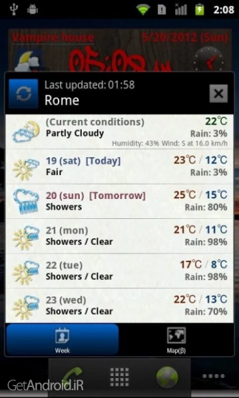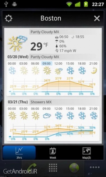پیش بینی آب و هوا، اطلاعات کنونی هوا و ساعت دقیق هر نقطه از جهان با پشتیبانی از تمامی شهرهای کشور ایران را بیابید. می توانید جزییات آب و هوا را تا 7 روز آینده داشته باشید. علاوه بر اینها می توانید احتمال باران را چک کرده، چشم انداز ماهواره و نقشه محل مورد نظرتان را ببینید. معمولا برنامه های امنیتی و Task killer ها به برنامه اجازه کار نمی دهند. در اینصورت لطفا این ویجت را از لیست آن برنامه ها خارج کنید. همچنین اگر برنامه را در لیست ویجت ها ندیدید بررسی کنید که آیا به SD card منتقل شده است یا خیر. در صورت بودن در کارت حافظه، آن را به حافظه داخلی بفرستید. درصورتیکه این نرم افزار در لیست ویجت هایتان یافت نشد، لطفا بررسی کنید که آیا در کارت حافظه تان نصب شده است یا خیر و سپس آن را به حافظه داخلی منتقل کنید.برخی از ویژگی های برنامه World Weather Clock Widget اندروید :
