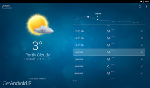 همیشه از اخرین تغییرات اب و هوایی مطلع خواهید شد و طوری طراحی شده است که تا حد ممکن ساده و شهودی بوده و تنها با یک کلیک میتوانید وضعیت اب و هوایی مکان فعلی خود را دریافت کنید.ویژگیهای برنامه Weather اندروید :