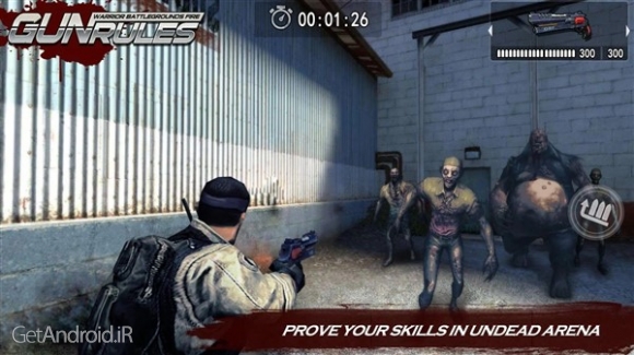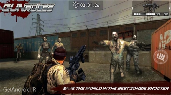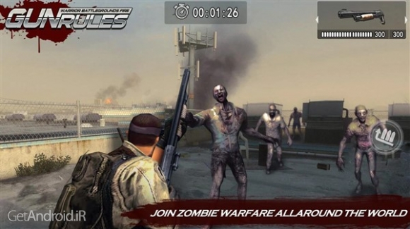 Gun Rules : Warrior Battlegrounds Fire 1.1.2 یک بازی اکشن از استودیوی بازیسازی GunBattle ZombieShooters Games Inc می باشد که در مارکت اندروید بصورت رایگان منتشر شده است. شما عضو تیم مبارزه با تروریسم هستید. شما تنها بازمانده هستید پس اسلحه خود را بردارید و به سمت زامبی ها تیراندازی کنید. همه جنگجویان توسط زامبی ها در میدان جنگ آلوده شدند. پس شما باید قهرمان را کنترل کنید وهنگامی که یک زامبی را هدف می گیرید سلاح بصورت خودکار تیراندازی می کند. بصورت سوم شخص مبارزه کنید و همه زامبی ها را در میدان نبرد از بین ببرید و جهان را نجات دهید. سگ های زامبی از هر طرف به سمت شما حمله ور می کنند و سرعت بالایی دارند، پس مراقب باشید تا به محض نزدیک شدن آنها را نابود کنید.