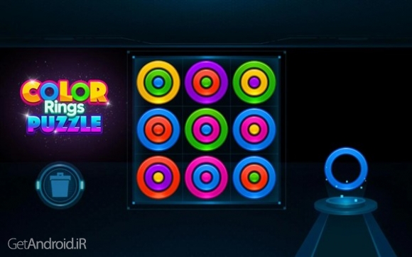 Color Rings Puzzle یک بازی پازلی از استودیوی بازیسازی Fun Free Fun می باشد که در گت اندروید بصورت رایگان منتشر شده است. در این بازی اندروید شما باید حلقه ی همرنگ را در ردیف قرار دهید تا با حلقه های همرنگ مشابه خود حذف شوند و بدین ترتیب امتیاز کسب کنید و امتیاز خود را با دوستانتان مقایسه کنید و خودتان را به چالش بکشید. همچنین شما می توانید به کمک سطل زباله حلقه های رنگ را تغییر دهید. برای انجام بازی باید حلقه های رنگی را در خطوط عمودی، افقی و مورب مرتب کنید و حلقه های همرنگ را با یکدیگر تطبیق دهید.