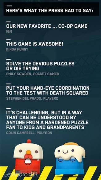Death Squared 1.1.0 یک بازی پازلی از استودیوی بازیسازی SMG Studio می باشد که در گت اندروید منتشر شده است. این بازی اندروید برای 1 یا 2 نفر در مورد هماهنگی، همکاری و انفجارهای ربات است شما باید ربات خود را انتخاب کنید و پازل ها را حل کنید و مراحل را با موفقیت پشت سر بگذارید. همچنین شما باید سعی کنید از موانعی که بر سر راهتان می باشد عبور کنید و در مسیر خود به پایین نیفتید و مراقب انفجار شخصیت خود باشید.