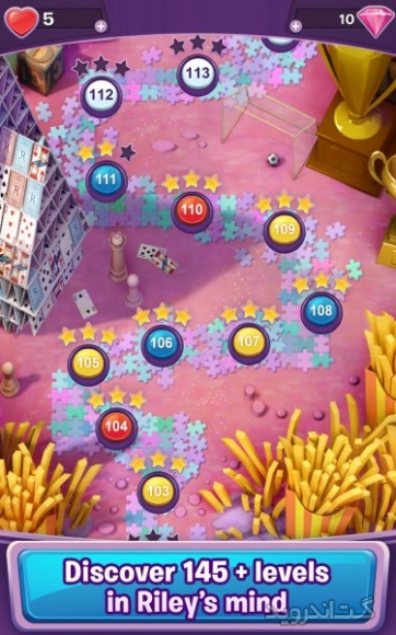 Inside Out Thought Bubbles یک بازی جذاب در سبک پازلی که توسط استودیوی بازیسازی Disney که به تازگی بصورت رایگان در مارکت اندروید منتشر شده است. که که بر اساس انیمیشن پرطرفداری به همین اسم ساخته شده است.سازنده این بازی از سازندگان بازی Frozen Free Fall and Where’s My Water می باشد که داستان آن در مورد شخصی به اسم Riley بوده که او در سن رشد است و مسیرهای مختلفی را باید طی کند.حداقل سه حباب هم رنگ باید در کنار یکدیگر قرار بگیرند تا حباب ها حذف شوند.این بازی دارای محیط رنگارنگی است.هر حباب احساساتی را درونش پنهان کرده که باید آنها را پرتاب کنید و با هر احساسی آن را تطبیق دهید.شخصیت های متفاوت این بازی را آنلاک کنید تا بیش از 200 سطح این بازی را کشف کنید که هر کدام یک بازی پازلی جدیدی را رقم می زند.