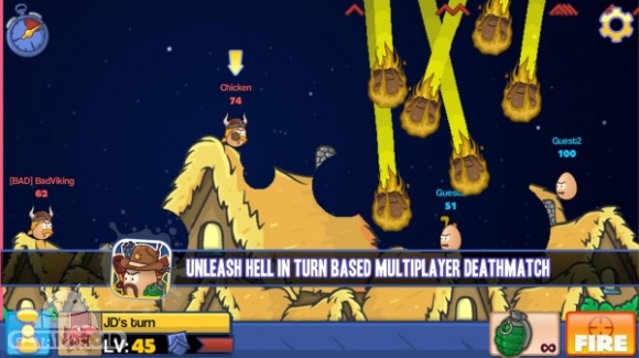Bad Eggs Online 2 v1.4.5 نام یک بازی استراتژیک برای دستگاه های مجهز به سیستم عامل اندروید است که توسط استودیوی Bad Viking منتشر شده و در دسترس کاربران قرار گرفته است. در این بازی مولتی پلیر آنلاین که بصورت turn-based (بر اساس نوبت) بوده شما باید به مصاف رقبا رفته و آنها را با استفاده از تجهیزات و مهمات گوناگون از پا در بیاورید. از جمله این تجهیزات میتوان به انواع راکت، نارنجک و امکان بمباران منطقه ای اشاره کرد. همانطور که از تصاویر هم بر میاید محیط بازی یک محیط بسیار فانتزی بوده و شما با کاراکترهایی عجیب و دوست داشتنی سر و کار خواهید داشت. بر اساس سیستم ارتقای بازی هم قادر خواهید بود با پیشرفت در بازی به امکانات بیشتری دسترسی داشته و کاراکترهای خود را شخصی سازی کنید.