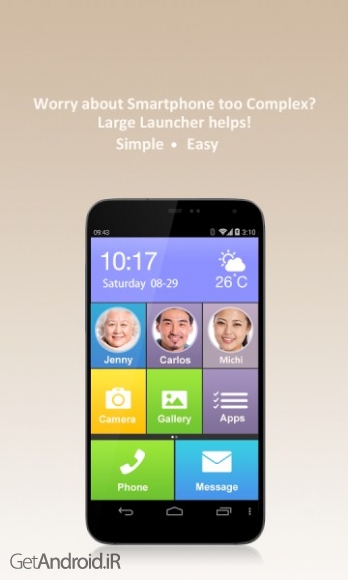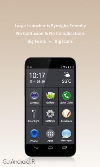 Large Launcher رابط کاربر هر تلفن یا تبلت را جایگزین میکند. با در نظر گرفتن سالمندان و افراد کم بینا به منظور فراهم نمودن حداکثر خوانایی و استفادهی آسان طراحی شده است.