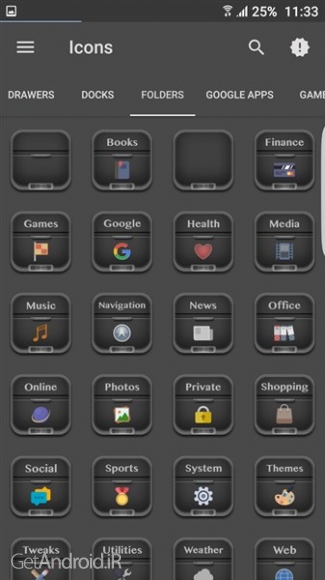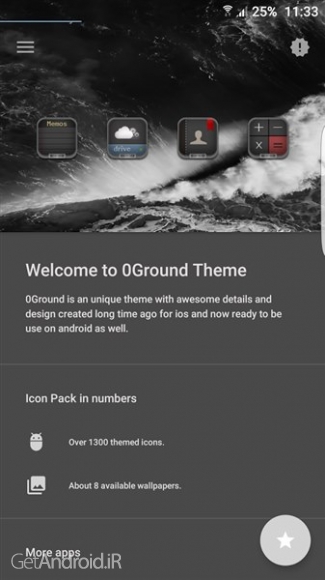 0Ground مجموعه ای بسیار زیبا و منحصر بفرد از آیکون هایی با رنگهای زیبا و حالت تیره می باشد که این بسته آیکون را از برنامه های مشابه دیگر متمایز میکند. این مجموعه از اکثر لانچر های معروف پشتیبانی کرده و بی شک حال و هوای تازه ای را به گوشی اندرویدی شما خواهد بخشید. توجه داشته باشید همانطور که در ابتدا هم گفتیم باید برای نصب این مجموعه ، ابتدا یکی از لانچرهای پشتیبانی شده را نصب کنید. این بسته آیکون از 17 لانچر معروف و عمده پشتیبانی میکند. (توجه داشته باشید که قابلیت TouchWiz پشتیبانی نمیشود .)