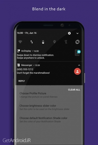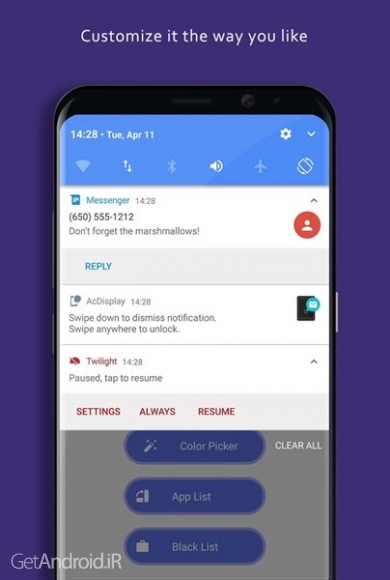 به صورت یک نوار وضعیت بسیار کامل رنگی بوده که متریال دیزاین برای زیباتر کردن گوشیتان در اختیار شما میگذارد. در نسخه پیشرفته و با استفاده از ویژگی لیست سیاه میتوانید از پنل اعلان ها بدون مشکل هم پوشانی استفاده کرده و حتی نوار وضعیت را در برنامه های انتخابی غیرفعال کنید. همچنین ٩ تم پنل اعلان نیز در اختیار شما خواهد بود.