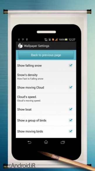 Ink Pro (Full version) 2.6 یک لایو والپیپر زیبا و متفاوت از یک منظره زیبا و قدیمی چینی است که کوه و درخت و یک رودخانه را به تصویر میکشد . برف در حال باریدن می باشد و دو قایق کوچک و زیبا در حال حرکت در رودخانه هستند و پرندگانی که در آسمان پرواز میکنند. شما میتوانید از بخش تنظیمات این والپیپر زنده ، سرعت حرکت قایق ها و همچنین سرعت پرواز پرنده ها را کم یا زیاد کنید. اگر از ظاهر تکراری و خسته کننده گوشی خود خسته شده اید ، گت اندروید برنامه Ink Pro را به شما پیشنهاد میکند.