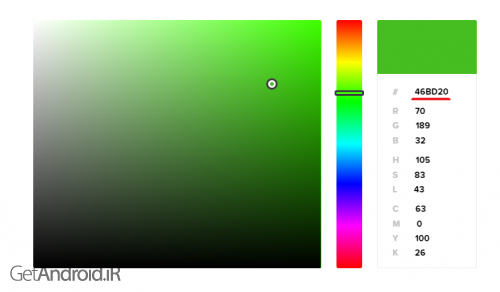 به عنوان مثال ما رنگ سبز رو انتخاب کردیم که کد مربوط به آن 46BD20 می باشد