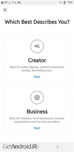در قسمت بعدی باید مشخص کنیم که میخواهیم پیج خود را به صورت creator تجاری کنیم یا به صورت business. حالت creator برای هنرمندان، بلاگر ها ، اینفلوئنسر ها و تولیدکنندگان محتوا مناسب است و حالت business هم برای برند ها، شرکت ها و کسانی که کار خدماتی انجام میدهند مناسب است. البته این دو در عمل تفاوت چندانی با هم ندارند.