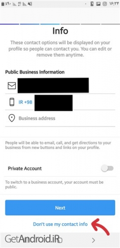 در قسمت بعدی باید گزینه های تماس خود یعنی ایمیل و شماره تماس را وارد کنیم تا در پروفایل ما برای مشتریان نمایش داده شود.اگر نمیخواهید که اطلاعات شما نمایش داده شود کافی است در قسمت پایین همین صفحه روی dont use my contact info کلیک کنید