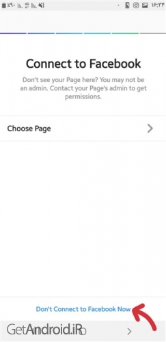 در صفحه بعد هم باید پیج خود را به اکانت فیسبوک خودتان وصل کنید. البته این کار را میتوانید انجام هم ندهید.کافی است رویdont connect to facebook now در قسمت پایین صفحه کلیک کنید.