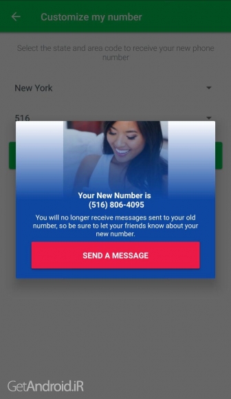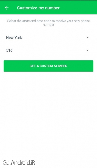 6- حالا باید یکی از ایالات را انتخاب کنید. بعد از انتخاب یکی از ایالت ها به طور دلخواه ، باید یکی از کد های منطقه ای را به طور دلخواه انتخاب کنید. توجه کنید که فرق خاصی بین این گزینه های نیست و هر کدام را که میخواهید میتوانید انتخاب کنید. بعد از انتخاب گزینه های دلخواه ، حالا دکمه ی “Get a Custom number” را لمس کنید.